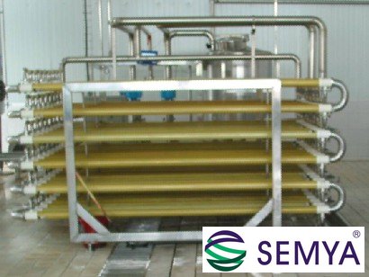 果漿經(jīng)過果漿加熱器,使果漿的溫度升溫到20-35度,以利于果漿酶分解和壓榨,提高出汁率。果漿加熱器的使用根據(jù)果漿的溫度而定。