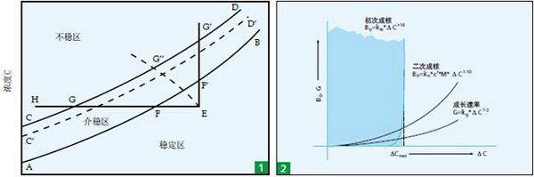 根據(jù)大量試驗的結(jié)果證實,溶液的過飽和與結(jié)晶的關(guān)系可用上圖1表示;圖中的AB 線為普通的溶解度曲線,CD 線代表溶液過飽和而能自發(fā)地產(chǎn)生晶核的濃度曲線( 超溶解度曲線),它與溶解度曲線大致平行。這兩根曲線將濃度——溫度圖分割為三個區(qū)城。在 AB 曲線以下是穩(wěn)定區(qū),在此區(qū)中溶液尚未達(dá)到飽和,因此沒有結(jié)晶的可能。AB 線以上為過飽和溶液區(qū),此區(qū)又分為兩部分:在 AB 與 CD 線之間稱為介穩(wěn)區(qū),在這個區(qū)域中,不會自發(fā)地產(chǎn)生晶核,但如果溶液中已加了晶種, 這些晶種就會長大。 CD 線以上是不穩(wěn)區(qū),在此區(qū)域中,溶液能自發(fā)地產(chǎn)生晶核。若原始濃度為 E 的潔凈溶液在沒有溶劑損失的情況下冷卻到 F 點(diǎn),溶液剛好達(dá)到飽和,但不能結(jié)晶,因為它還缺乏作推動力的過飽和度。從F 點(diǎn)繼續(xù)冷卻到 G 點(diǎn)的一段期間,溶液經(jīng)過介穩(wěn)區(qū),雖已處于過飽和狀態(tài),但仍不能自發(fā)地產(chǎn)生晶核。只有冷卻到 G點(diǎn)后,溶液中才能自發(fā)地產(chǎn)生晶核,越深入不穩(wěn)區(qū)(例如達(dá)到 H 點(diǎn)),自發(fā)產(chǎn)生的晶核也越多。由此可見,超溶解度曲線及介穩(wěn)區(qū)、不穩(wěn)區(qū)這些概念對于結(jié)晶過程有重要意義。把溶液中的溶劑蒸發(fā)一部分,也能使溶液達(dá)到過飽和狀態(tài),圖中 EF ’ G’線代表此恒溫蒸發(fā)過程。在工業(yè)結(jié)晶中往合并使用冷卻和蒸發(fā),此過程可由 EG’’線代表。